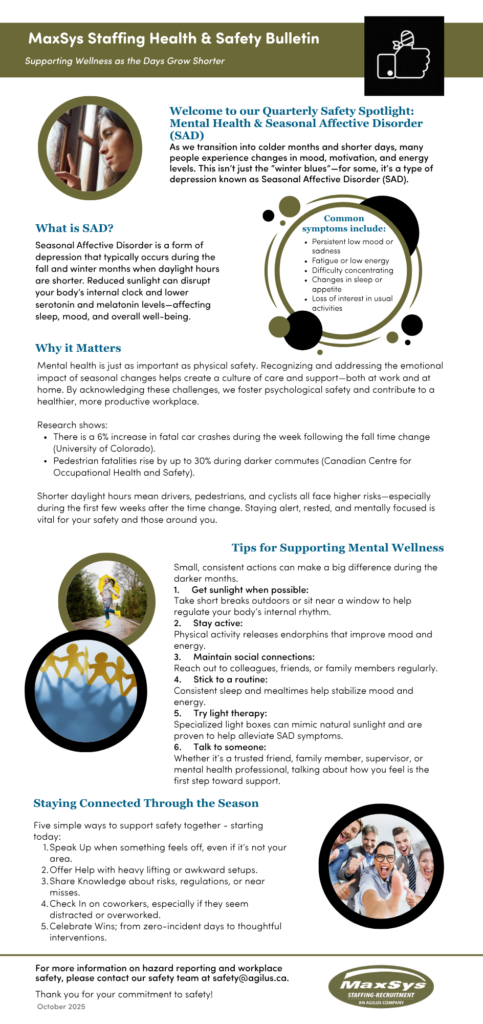 Shorter daylight hours can take a toll on both mental health and workplace safety, and many people feel the strain more than they realize. This bulletin unpacks the signs of Seasonal Affective Disorder (SAD) and why staying connected and aware is so important this time of year. Explore simple, effective ways to support yourself and others as we head into the winter season.